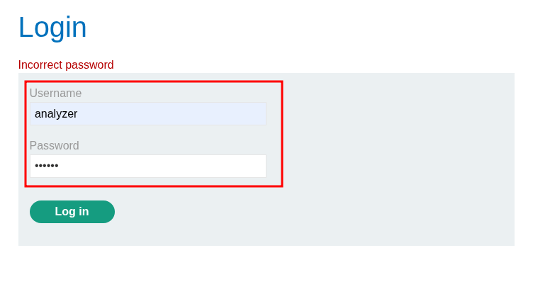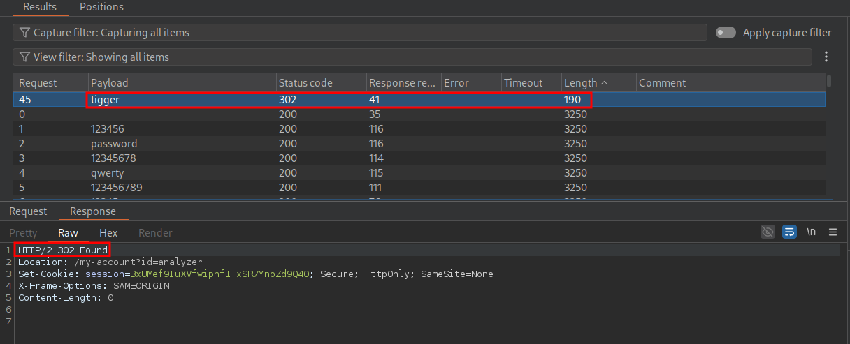 Filtering the response via length we can see we get a valid hit for the username “analyzer” as it has a difference response of “Incorrect password”