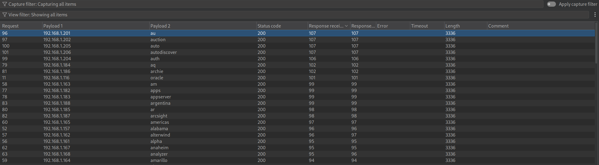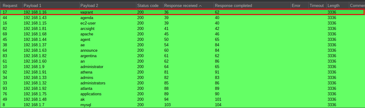 Due to this being a timing issue we can look at response times when we fuzz. +Note+: I started this lab a while ago and then went on holiday (vacation), this means that the screenshots and source addresses may seem a bit all over the place, just focus on the theory I provide and it will work.