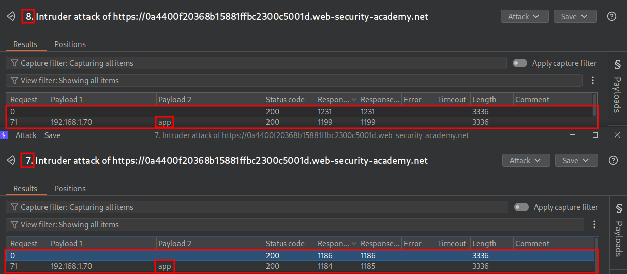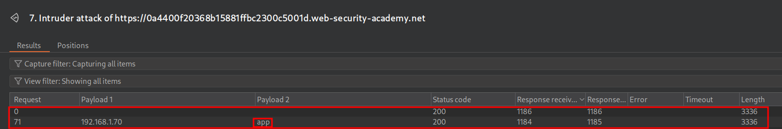 Starting the attack again we get a more promising result for the username “app” this time the response time is close to the same time as our known user “wiener”.