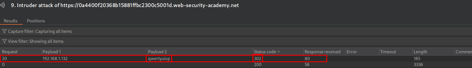 We get a hit for the password qwertyuiop as we have a 302 response!