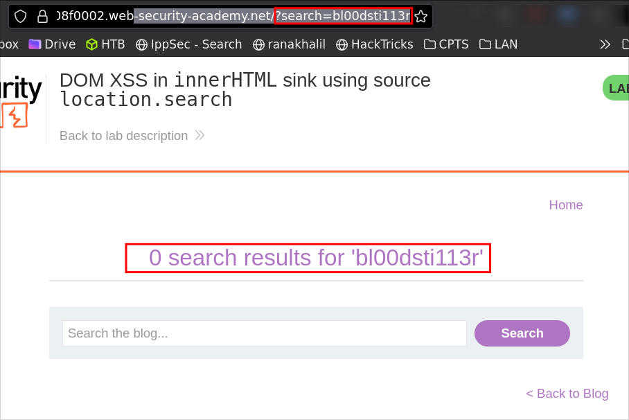This lab contains a DOM-based cross-site scripting vulnerability in the blog search. It takes data from