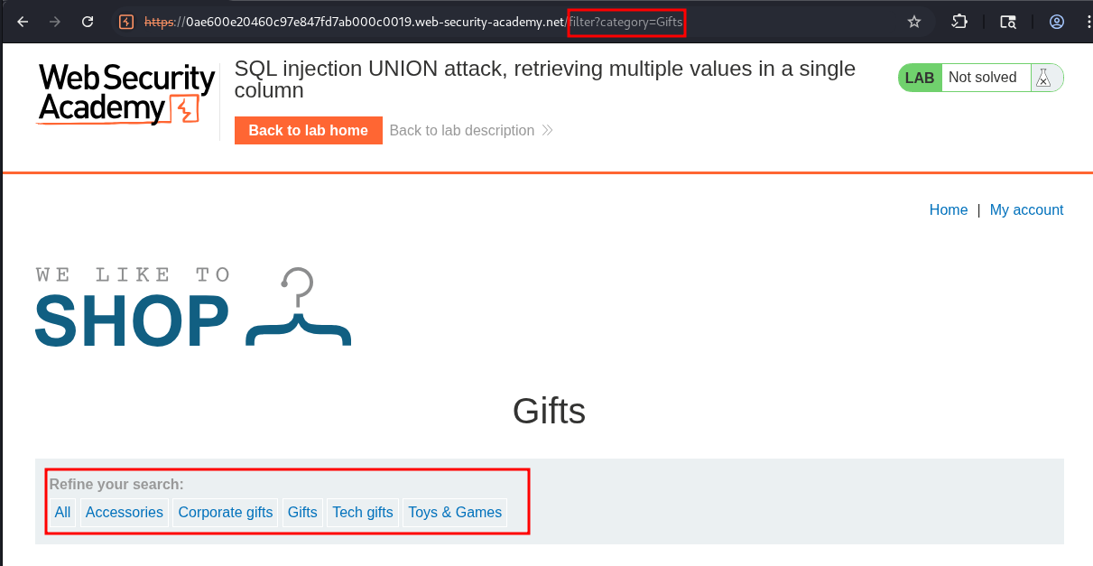 url="https://0ae600e20460c97e847fd7ab000c0019.web-security-academy.net/filter?category=Gifts"