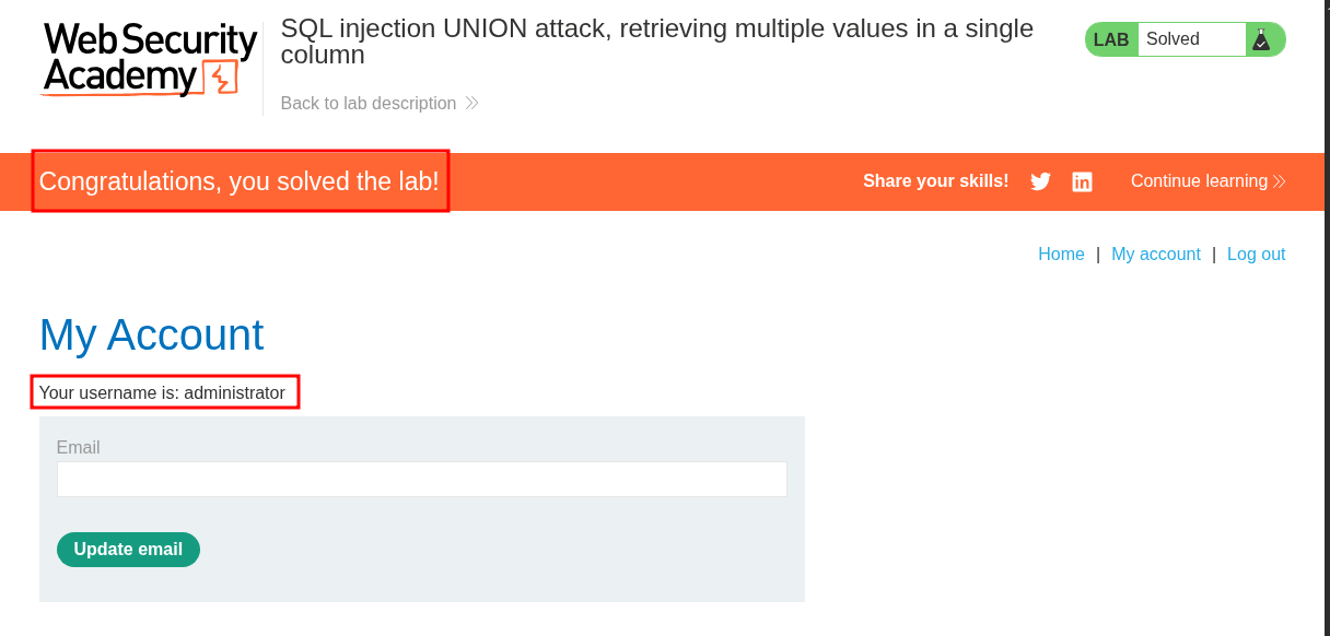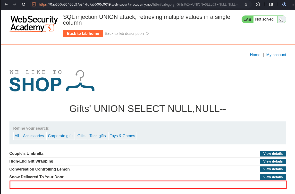 Lab 6: SQL injection UNION attack, retrieving multiple values in a single column: