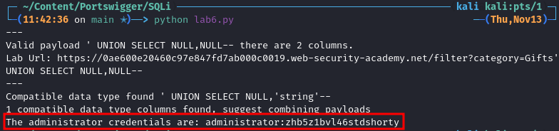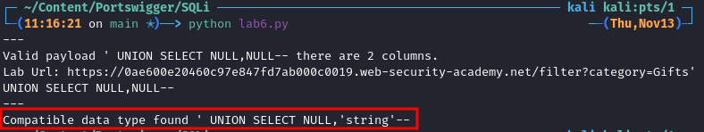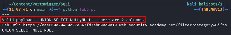 "Valid payload {payload}-- there are {counter} columns."which will contain the actual payload as well as the number of columns. - Print the full Lab URL including comment and payload so we can easily verify it in a browser.
