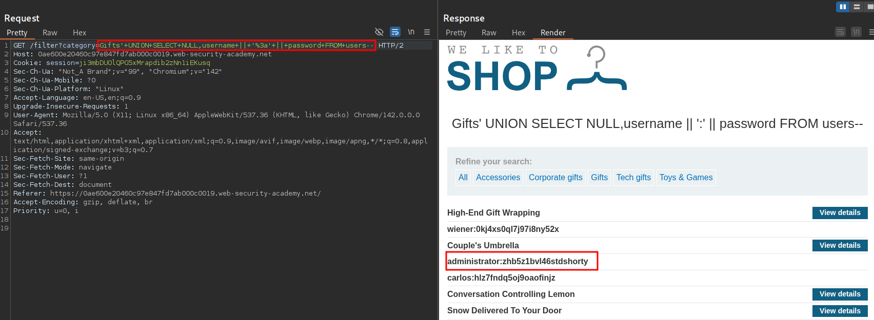 To solve the lab, perform a SQL injection UNION attack that retrieves all usernames and passwords, and use the information to log in as the administrator user.