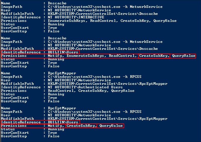 With this privilege you can’t modify existing subkeys or their values; like Parameters/Security